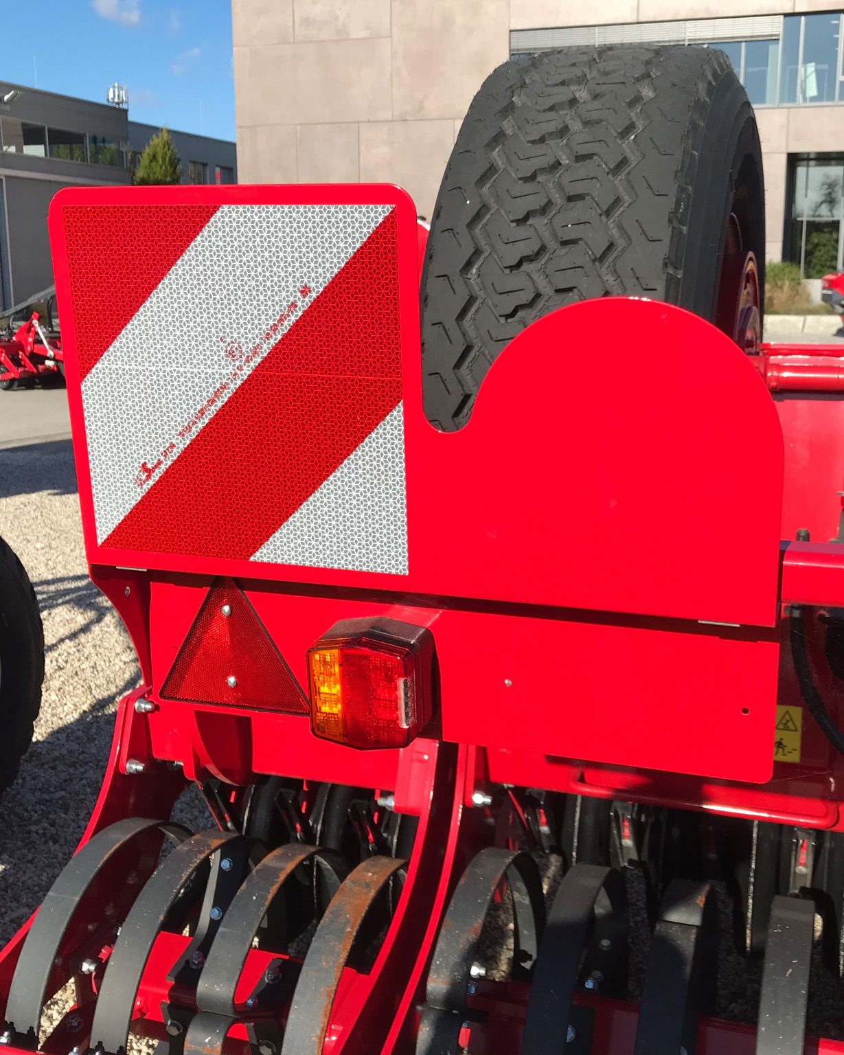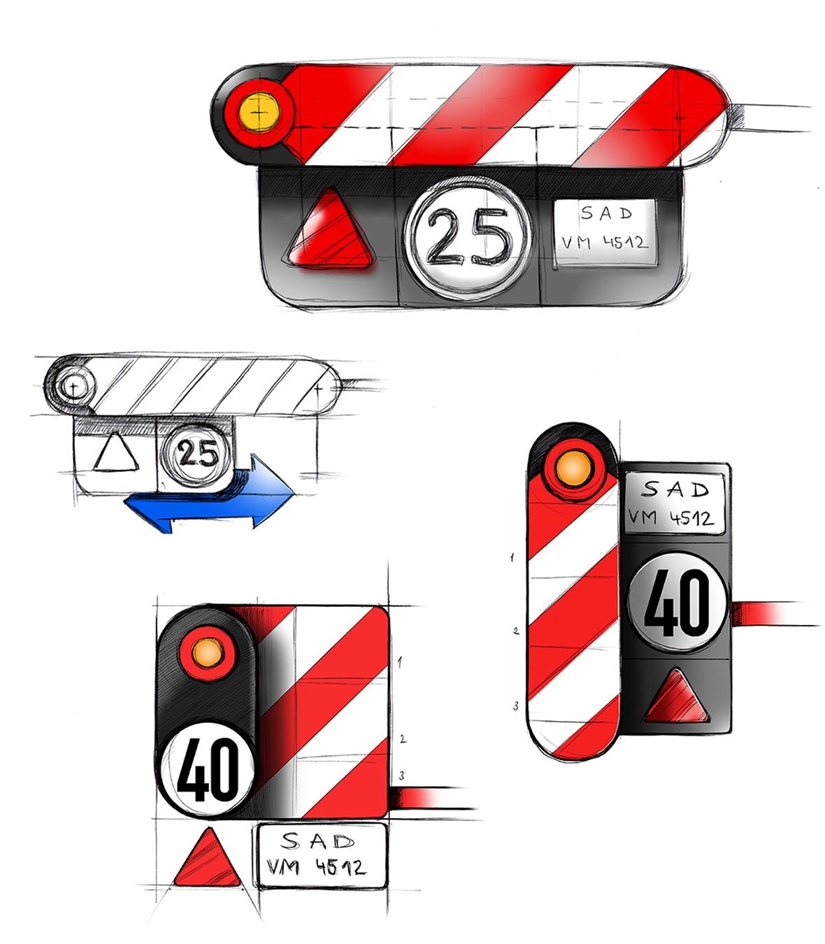 Eine runde HELLA-Leuchte an der außenliegenden Seite des Trägers wird von einer dunklen Kontrastfläche in Szene gesetzt. Die rot-weiß-gestreifte Signalfolie läuft dabei wie ein Pfeil auf den Lichtring zu und weist nach außen. Dadurch kann auch geschickt der nötige Maximalabstand zum Rand von 100 mm eingehalten werden. Durch modular erweiterbare, dunkle Paneele können bei Bedarf Reflektor-Dreieck, Geschwindigkeitsschild und Kennzeichen angebracht werden, ohne dass die Einfachheit und Ruhe des Beleuchtungsträgers verloren geht. Ein Modell in Realgröße veranschaulicht die Anbringung der Elemente an der Rückseite des Signaltafelkörpers. Das Design konnte das Horsch Gremium begeistern und erhielt Anerkennung für den neuwertigen Gestaltungsansatz.