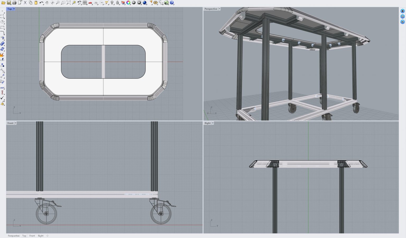 Das Konzept greift den Hofmeisterknick in den abgerundeten Kanten auf. Für nahtlose Übergänge der Tischkanten sollen, mittels 3D-Druck, Adapter gedruckt werden, die die scharfen Ecken der Aluminiumprofile ersetzen. Um das Gewicht der Tischplatte aus Polygood-Material stabilisieren zu können, ist eine Gitterkonstruktion vorgesehen an der gleichzeitig die abgeschrägten Aluminiumprofilkanten  befestigt werden können. Aus der Modellierung konnte eine Stückliste erstellt und geliefert werden.