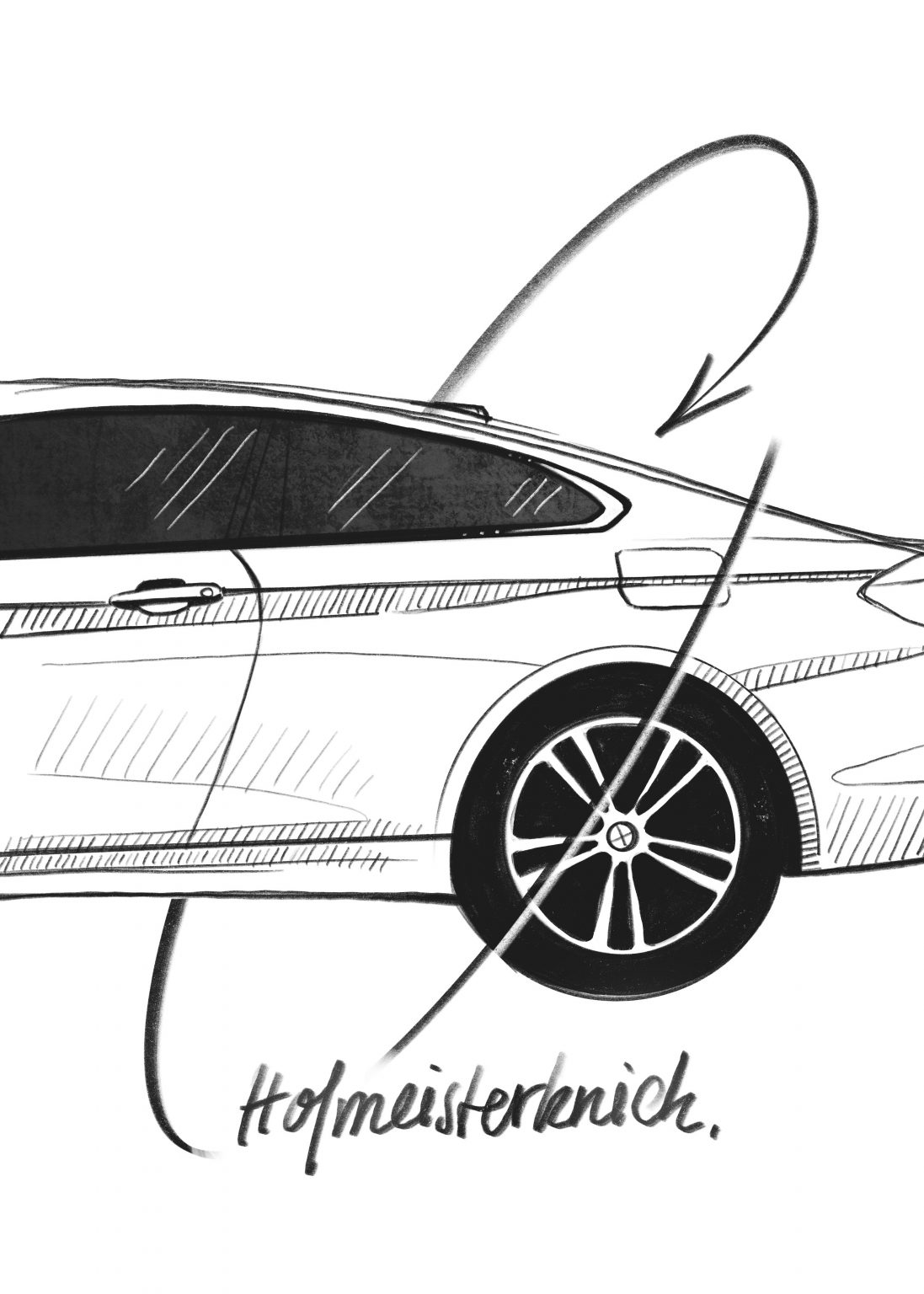 Nach einer Recherchephase fand ich Inspiration im Hofmeister-Knick. Der doppelt geknickte Übergang von der C-Säule zum Wagenkörper zeichnet seit 1961 jeden BMW aus und ist ein nicht mehr wegzudenkendes Gestaltungselement. Dieses Merkmal sollte im Besprechungstisch inkorporiert werden.