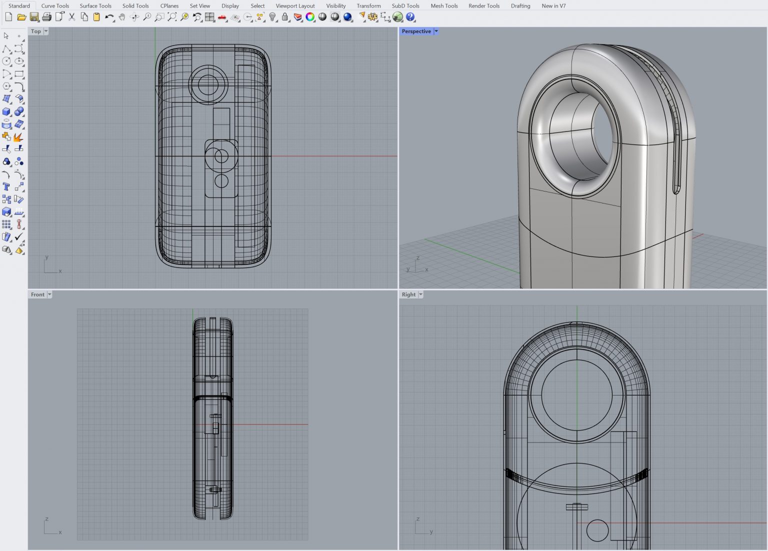 Auf Basis mehrerer Skizzen wird im Schritt 3D-Modellierung das Produkt digital im CAD-Programm Rhino 7 nachgebaut. Hierbei werden Proportionen, fertigungsrelevante Details und weitere Designentscheidungen konkretisiert.