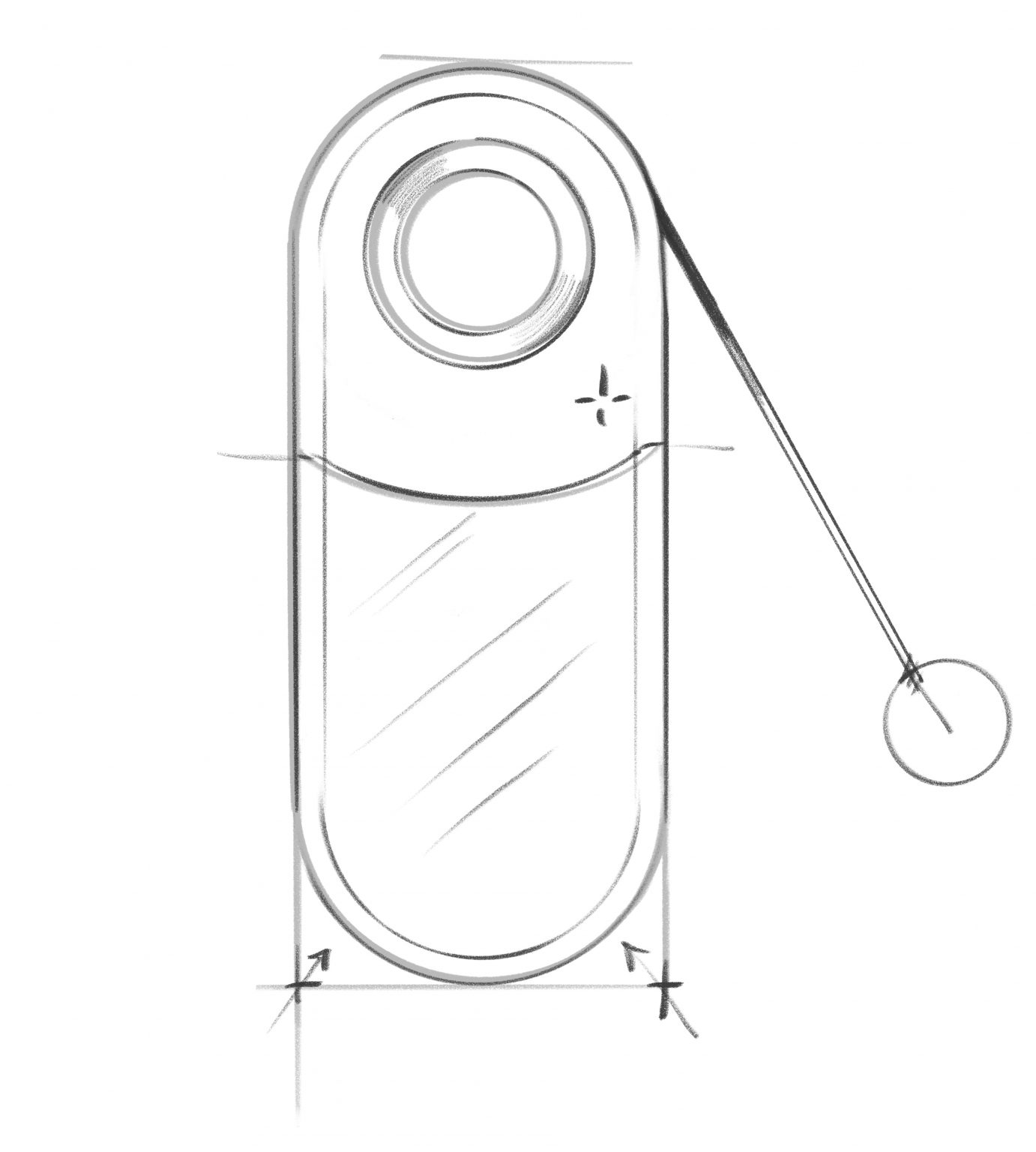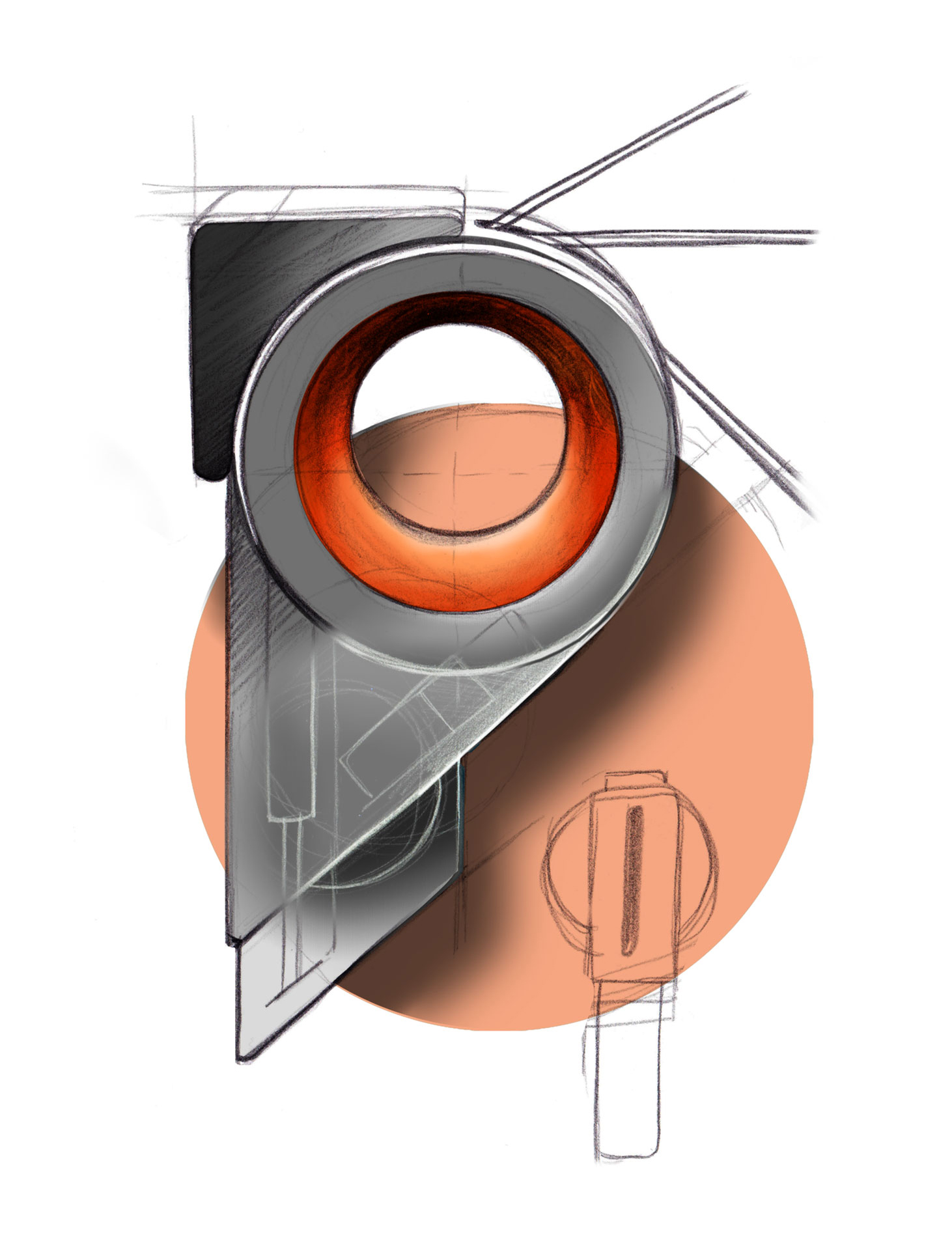 Der erste Entwurf nutzt die Seilrolle als zentrales Designelement und betont sie durch einen farbigen, gummierten Innenring. Dieser hebt nicht nur den funktionalen und technischen Aspekt der Seilrolle hervor, sondern ermöglicht auch eine vielseitige Nutzung als Transportgriff, Handtuchhalter und Wiedererkennungselement. Darüber hinaus verleiht das Loch dem Produkt eine leichtere und offenere Erscheinung. Dieses Designelement bildet die Basis für den weiteren Entwurfsprozess.