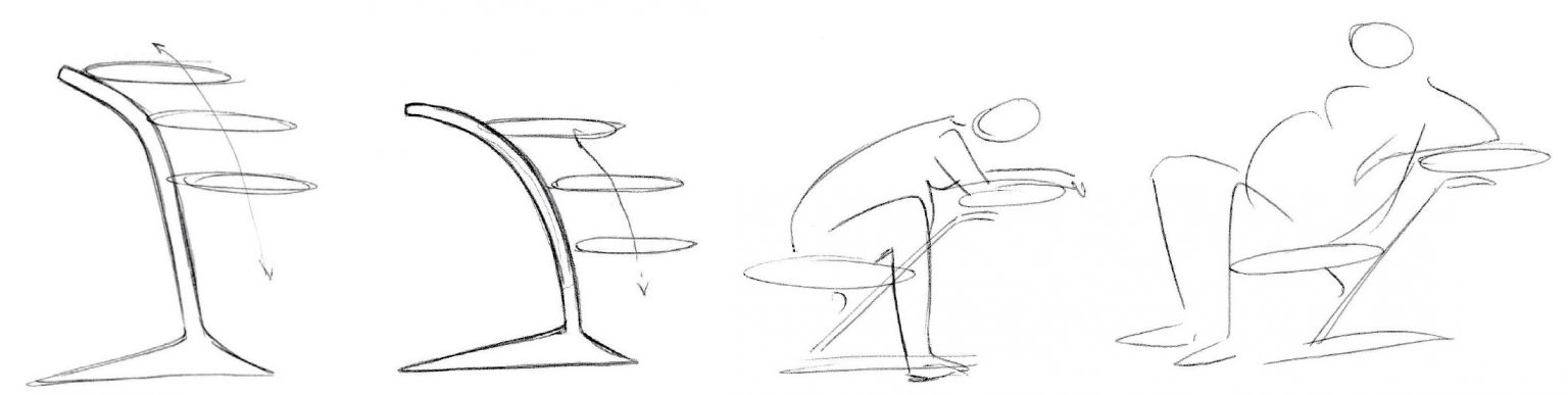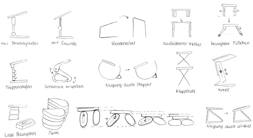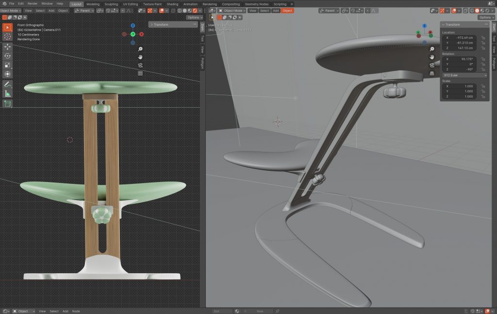 Das Modell wurde in Blender konstruiert, um Klarheit über reale Dimensionen und Proportionen zu erhalten. Verschiedene Höhen und Sitzflächen wurden in einem Iterationsprozess entwickelt und schließlich auf eine Form festgelegt.