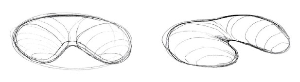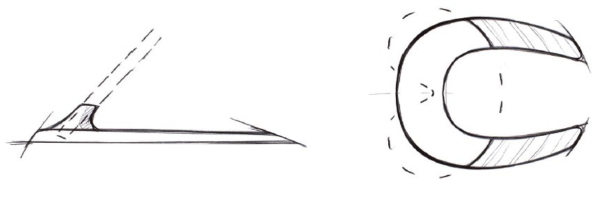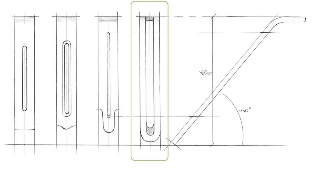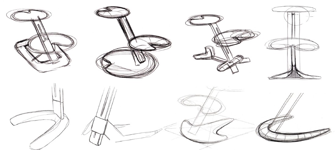 Klassische Gebärhocker weisen drei bis vier Beine vor, die den Sitz stabilisieren. Da hier ein Trägerelement eingesetzt wird, liegt in einem Punkt die Krafteinwirkung, welche durch das Fußelement gleichmäßig verteilt werden muss. Eine Reihe an Iterationen ergab die Form einer flachen U-förmigen Platte, die material- und platzsparende Eigenschaften bietet und die Stolpergefahr für die Gebärende, Hebamme und Partner minimiert.