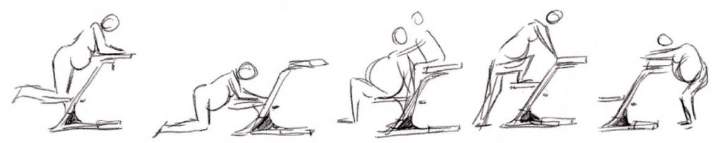 Die Sitzfläche ist leicht und flexibel, um sich optimal an verschiedene Körperhaltungen anzupassen. Ziel ist es, natürliche, aufrechte Gebärpositionen zu unterstützen und nicht nur die klassische Hocke. Auch der/die Partner:in soll in die Haltungseinnahme und den Geburtsprozess einbezogen werden.