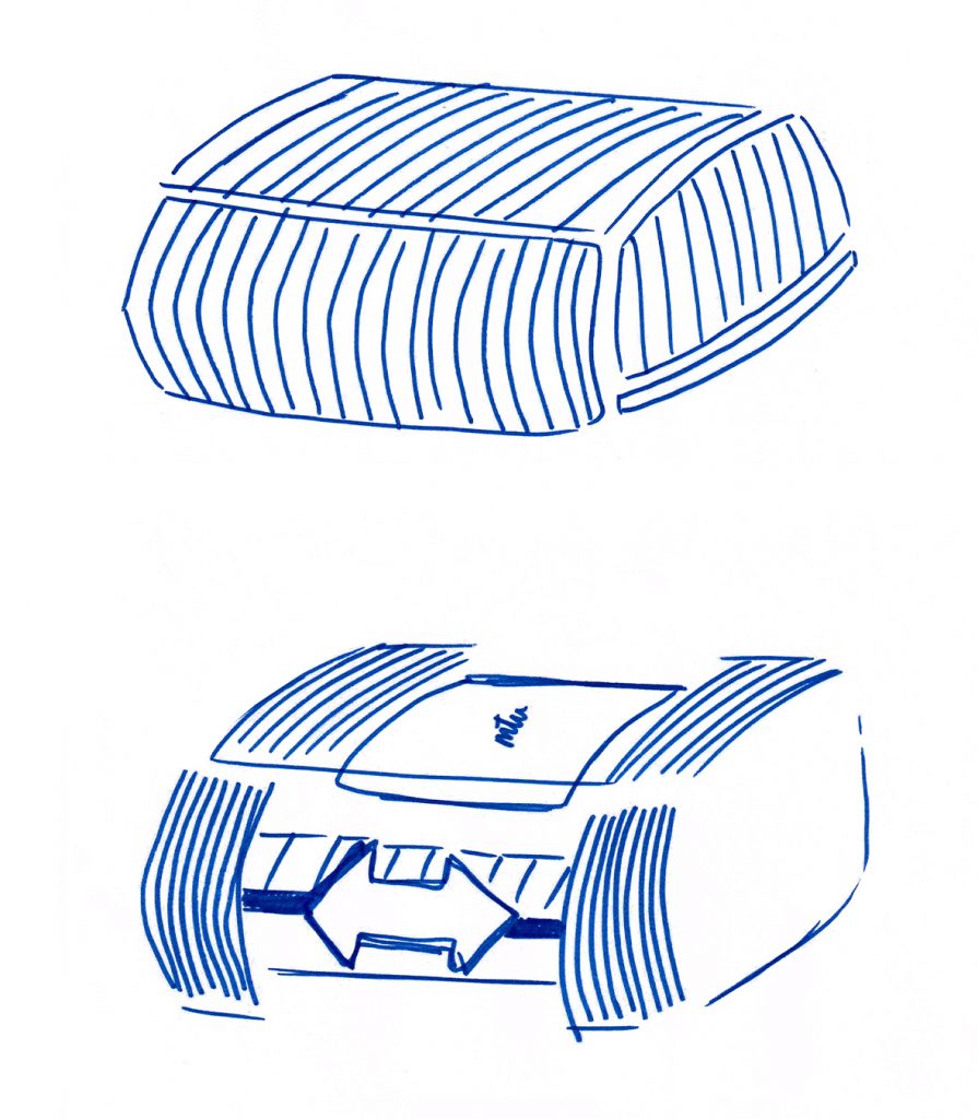 Nach einer breit gefächerten Ideengenerierungsphase sollte die Effizienz und Reinheit des durchoptimierten E-Fuel-Motors dargestellt  werden. Erste Skizzen zeigen die Ideen das Gehäuse mittels Lamellen umzusetzen, um entstehende Temperaturen nicht einzuschließen.